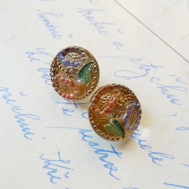 つくられたアンティークガラスボタンです。一つ一つが手づくりで、昔から使い続ける型にガラスを流し込んで成形し、職人が手作業で彩色を施したもの。生産数が少ないので、大変希少な商品です。