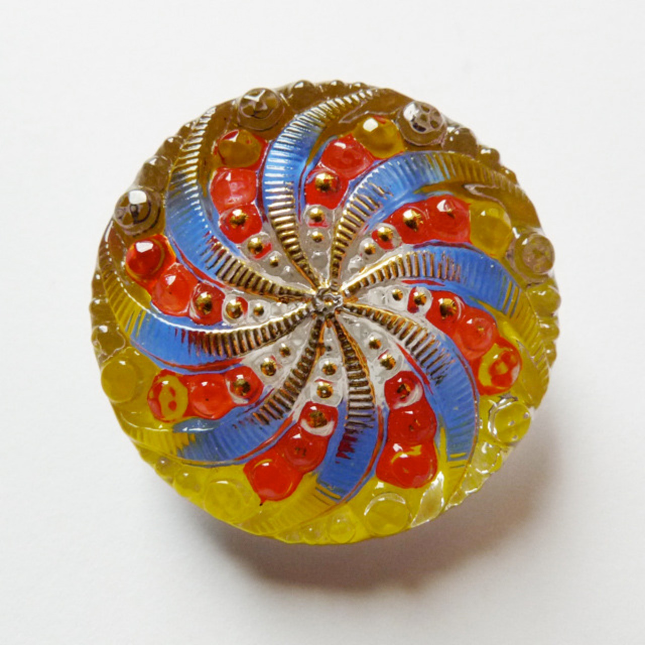 つくられたガラスボタンです。一つ一つが手づくりで、昔から使い続ける型にガラスを流し込んで成形し、職人が手作業で彩色を施したもの。生産数が少ないので、大変希少な商品です。