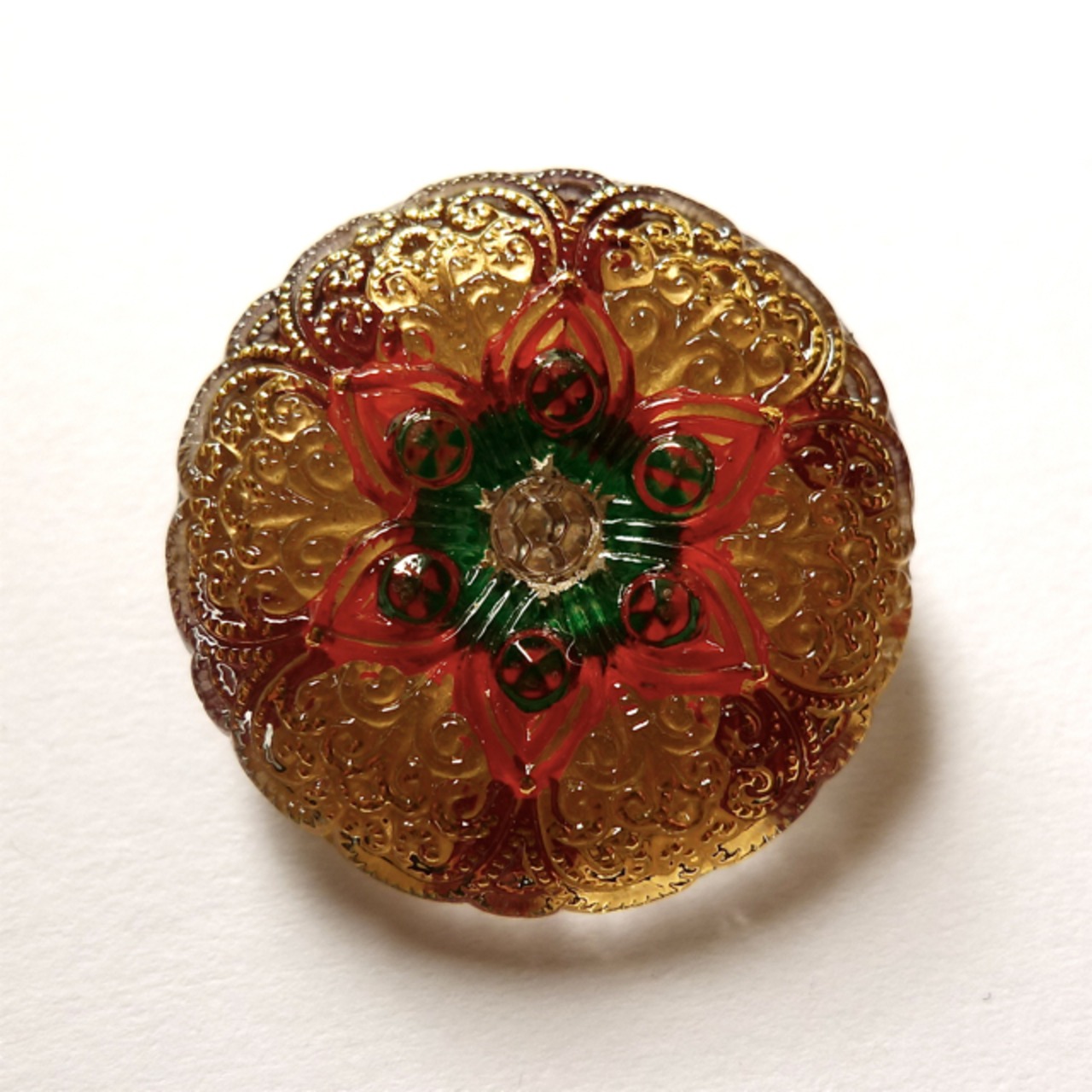 赤と緑に金の彩色が施された艶やかなボタンです。