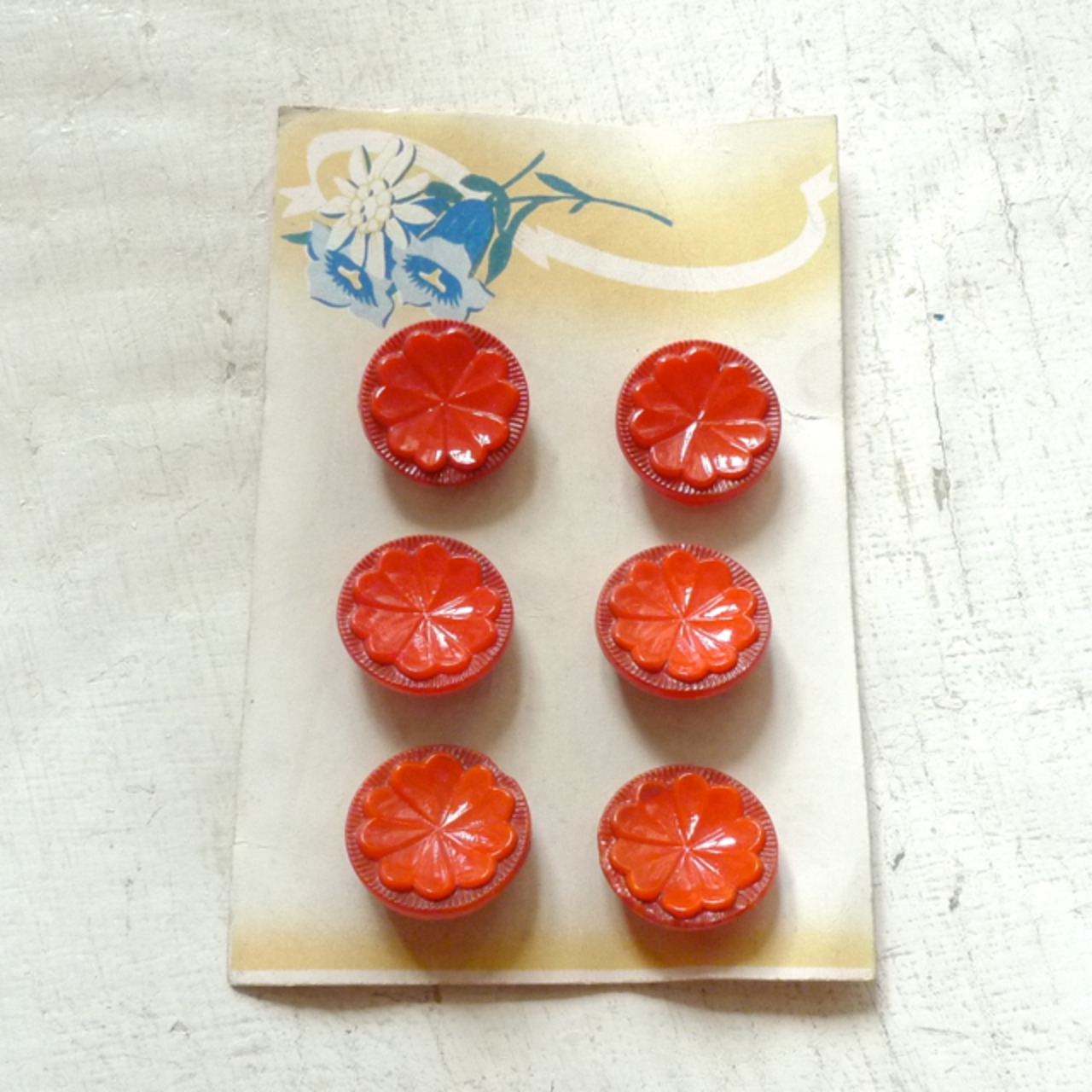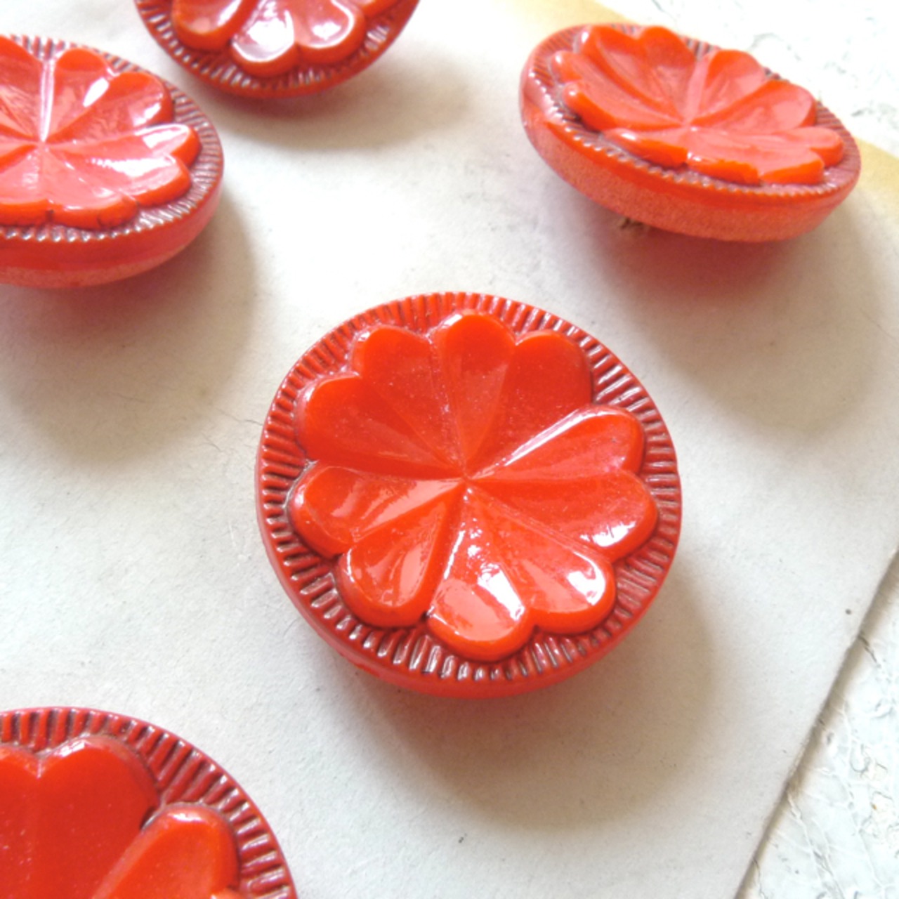 朱色に近い赤のガラス地にお花のレリーフがついたボタン。