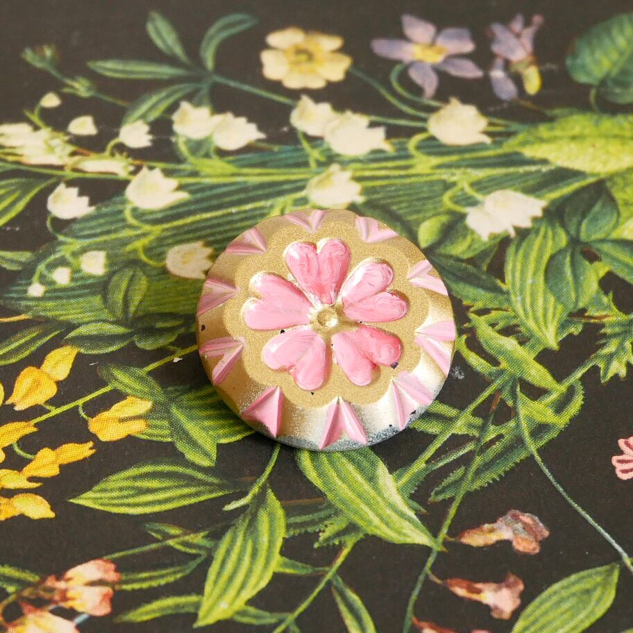 表は金の下地にかわいらしいピンク、裏側は黒の彩色が施されています。